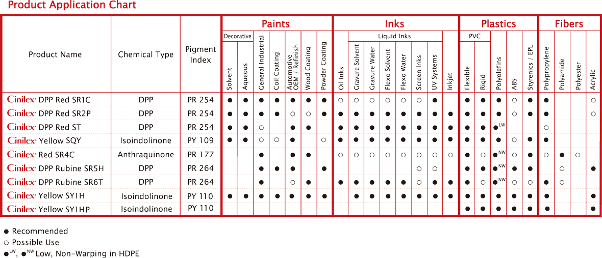 先麗® (Cinilex® )高性能有機(jī)顏料適用于聚烯烴(Polyolefin)、聚氯乙烯(PVC)、聚甲醛(POM)、橡膠及高分子共聚物等塑料體系中,廣泛用于有高耐候要求的戶外塑料制品、加工使用過(guò)程中有高耐溫要求的塑料制品和需要與食品直接接觸的塑料包裝制品中。