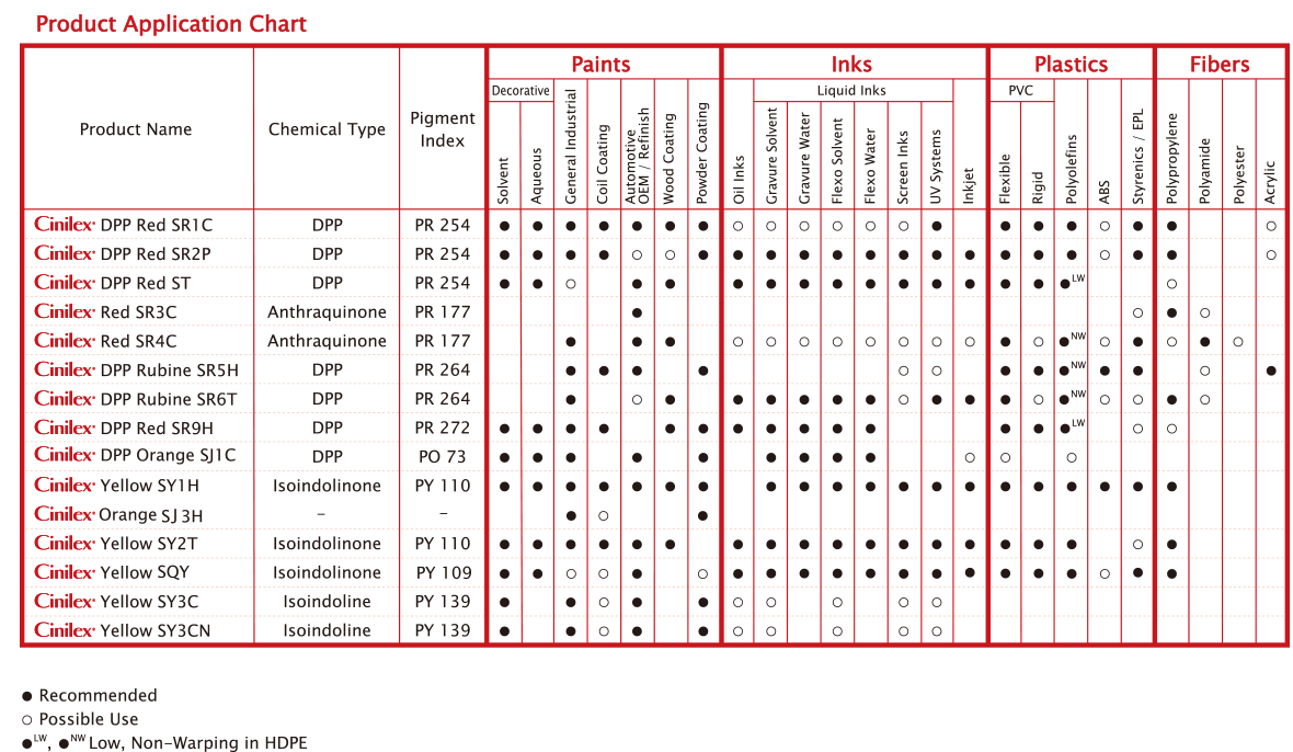 先麗®(Cinilex® )高性能有機(jī)顏料適用于溶劑型、水性等涂料體系,廣泛用于汽車(chē)原廠漆、修補(bǔ)漆、建筑涂料、工業(yè)涂料、船舶涂料、防腐涂料等行業(yè)。先麗®(Cinilex®)高性能有機(jī)顏料適用于溶劑型、水性等油墨體系,廣泛用于高耐光、耐候要求的木紋紙裝飾油墨、戶外廣告噴墨以及與食品接觸的包裝油墨、紙張油墨等行業(yè)。